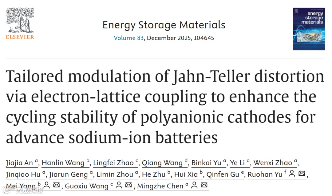 近日,南京理工大学陈明哲教授/杨梅教授与武汉理工余若瀚博士、悉尼科技大学汪国秀教授团队合作,在国际顶尖能源期刊《Energy Storage Materials》上发表了题为“通过电子-晶格耦合调控姜泰勒畸变以增强钠离子电池聚阴离子正极循环稳定性”的研究论文。该研究创新性地提出了一种“电子-晶格耦合”策略,通过引入Ti⁴⁺在NaMnPO₄中构建Mn-O-Ti超交换相互作用,实现了对姜泰勒畸变的精准调控,同时从电子起源和晶格应力消散两个层面解决了结构稳定性的难题,制备出的正极材料展现优异的循环寿命。