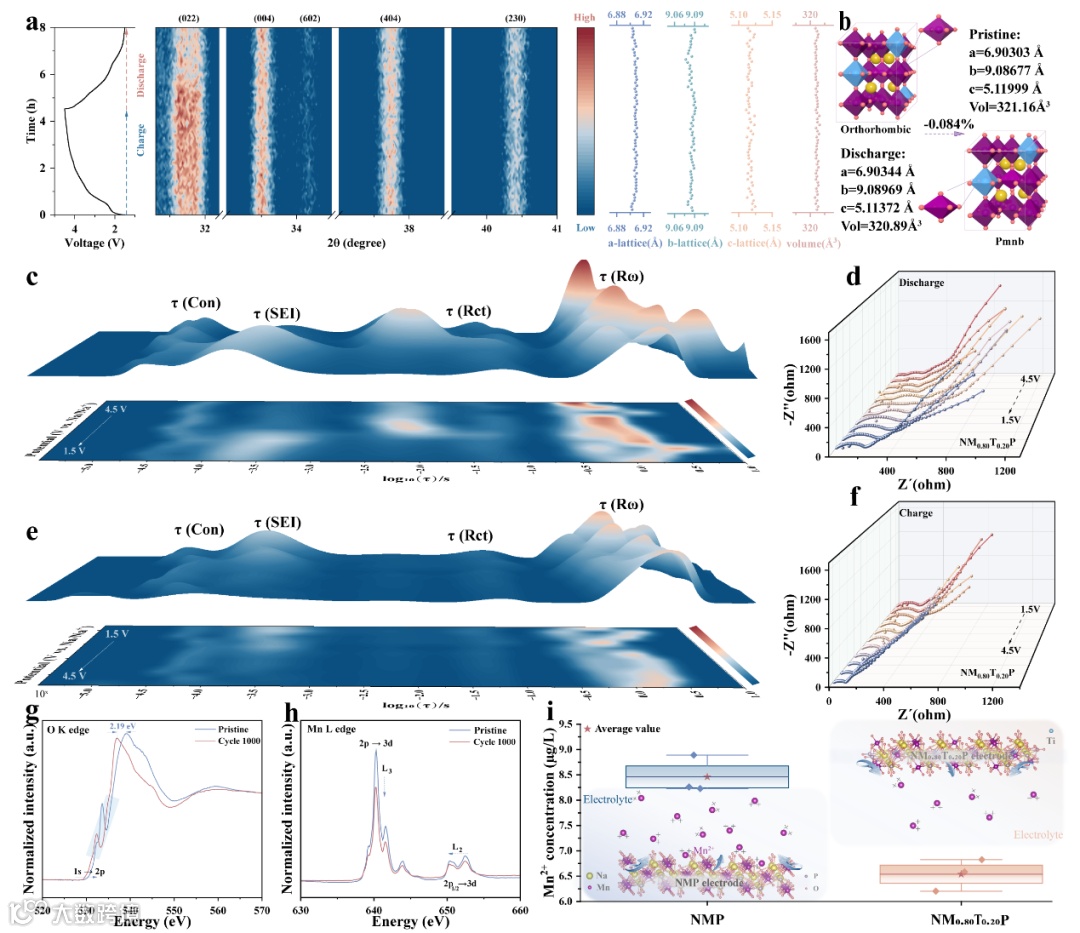 图 5:NM₀.₈₀T₀.₂₀P 正极的反应机理及其演变。(a) 0.1 C 倍率循环过程中的原位 XRD 等高线图;(b) 晶格演变示意图:原始状态 vs. 循环后状态;(c) 放电过程(4.5 V 至 1.5 V)中的非原位 DRT 图谱;(d) 放电过程中相应 EIS 奈奎斯特图的演变;(e) 充电过程(1.5 V 至 4.5 V)中的非原位 DRT 图谱;(f) 充电过程中相应 EIS图的演变;(g) O K-edge NEXAFS 对比:原始状态 vs. 1000 次循环后;(h) Mn L-edge NEXAFS 对比:原始状态 vs. 1000 次循环后;(i) 提出的长期循环后 Mn 溶出机制。