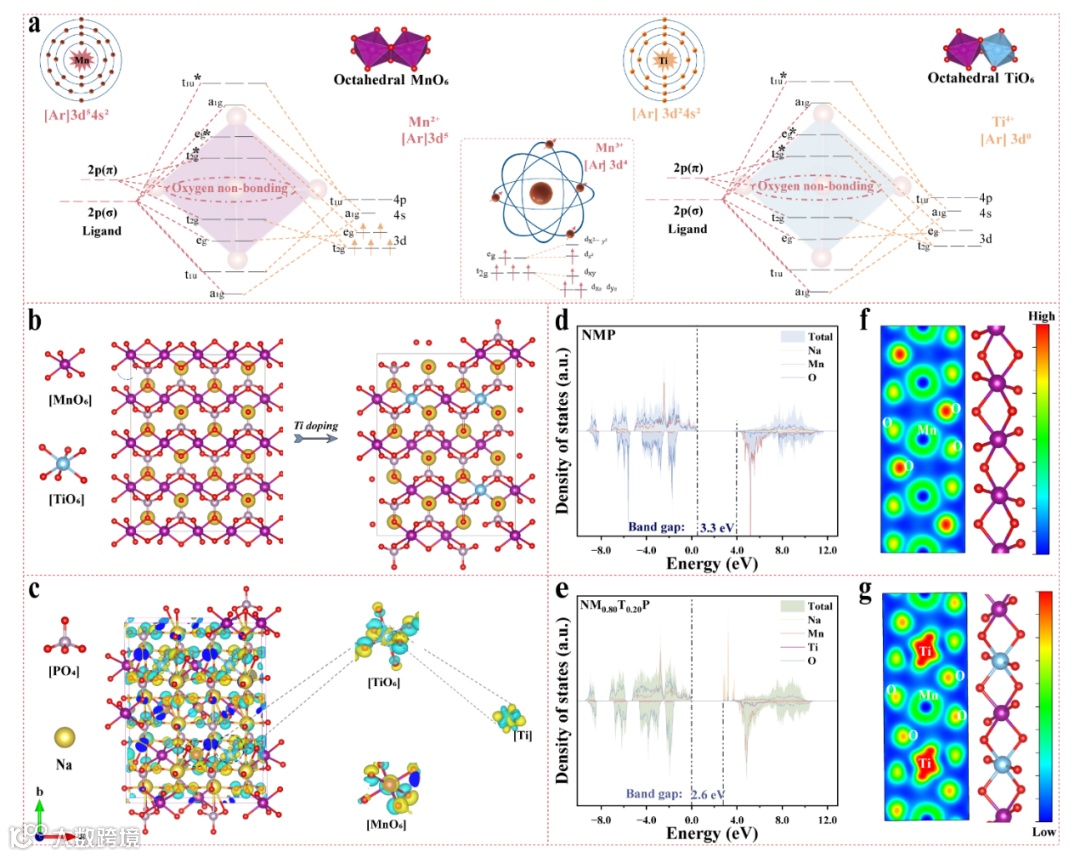 图 6:Ti 取代调控电子结构的 DFT 分析。(a) [MnO₆] 和 [TiO₆] 八面体中的轨道分裂(eg/t2g 配体场),插图为 Mn³⁺ 轨道占据;(b) 优化后的 POSCAR 模型:NMP vs. NM₀.₈₀Ti₀.₂₀P;(c) NM₀.₈₀Ti₀.₂₀P 的三维电荷密度差分等值面;(d) NMP 的态密度 (DOS);(e) NM₀.₈₀Ti₀.₂₀P 的总态密度 (DOS);(f) NMP 和 (g) NM₀.₈₀Ti₀.₂₀P 的部分电荷密度差分图。