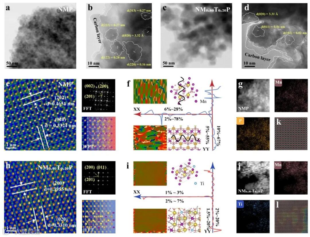 图 3:NM₀.₈₀T₀.₂₀P 正极的原子尺度结构演变。(a) NMP 的低倍 HAADF-STEM 图像(比例尺:50 nm);(b) NMP 的原子分辨率 HAADF-STEM 图像;(c) NM₀.₈₀T₀.₂₀P 的低倍 HAADF-STEM 图像(50 nm);(d) NM₀.₈₀T₀.₂₀P 的原子分辨率 HAADF-STEM 图像,在 10 nm 尺度显示碳包覆层;(e) NMP 的晶格结构,插图为 FFT 衍射图,以及 FFT 滤波区域:d₂₀₂ = 0.4651 nm, d₀₂₀ = 0.3324 nm;(f) NMP 应变场的几何相位分析 (GPA);(g) NMP 的 STEM-EDS 元素分布图;(h) NM₀.₈₀T₀.₂₀P 的晶格结构,插图为 FFT 图,经 IFFT 处理后的图像:d₂₀₀ = 0.3955 nm, d₀₂₀ = 0.3310 nm;(i) NM₀.₈₀T₀.₂₀P 应变分布的几何相位分析 (GPA);(j) NM₀.₈₀T₀.₂₀P 的 STEM-EDS 元素分布结果;(k) NMP 和 (l) NM₀.₈₀T₀.₂₀P 材料的原子分辨率元素分布图。
