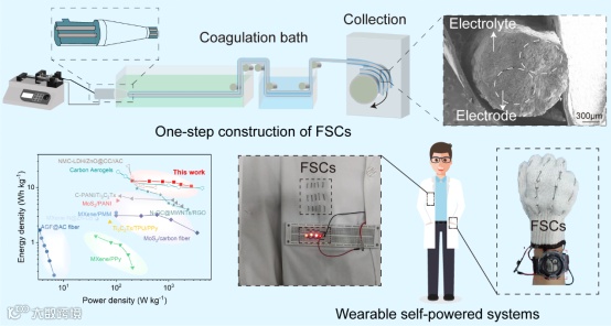 图形摘要:(上)一步同轴湿法纺丝构建皮芯结构纤维状超级电容器(FSC);(下左)与已报道数据相比的FSC拉贡图;(下右)纤维状超级电容器编织入纺织品为 LED 与电子手表供电。