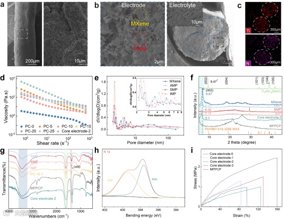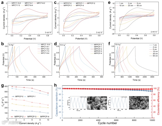 在电极材料设计上,团队构建了MXene、PANI与MWCNTs-COOH的多元复合体系。其中,PANI不仅是赝电容活性物质,更插入MXene层间起着“分子间隔柱”的作用,从而有效抑制其片层堆叠,为离子迁移创建丰富通道;而MWCNTs-COOH则作为贯穿电极的“导电骨架”,与MXene协同构建了高效的电子传输网络。这种协同三种材料性能的三位一体设计,在微观尺度上实现了离子可及性与电子传导性的协同优化。