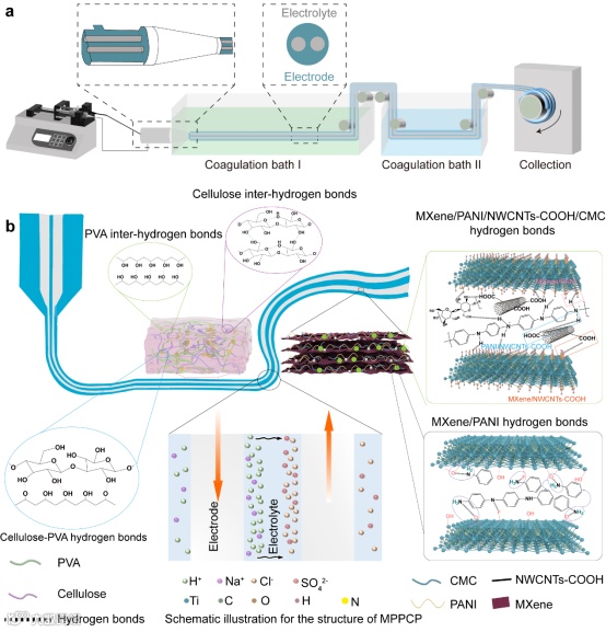 本研究的核心突破在于开发了一种可规模化的“一体化”同轴湿法纺丝技术。该技术通过同步共挤皮层(纤维素/PVA/PSS电解质)与芯层(MXene/PANI/MWCNTs-COOH电极)纺丝液,利用纤维素在酸性凝固浴中的快速相变特性,使纤维的电极与电解质在成型瞬间原位集成为一体。这种制备方法从根本上跳过了传统多步法的繁琐流程,从源头上消除了因分步组装导致的界面接触电阻高、结合力弱等固有问题,为高性能纤维器件的制备奠定了坚实的基础