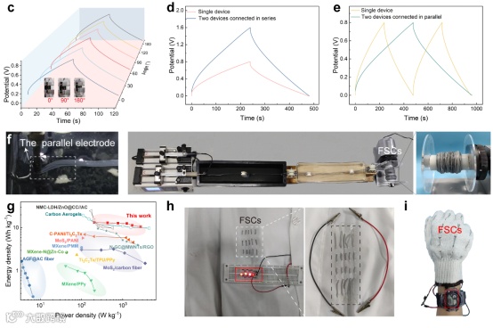 由于所得一体化FSC具有良好的柔韧性,在不同弯曲状态下充放电性能几乎不变,即使历经数千次弯折仍能稳定工作。当将这种FSC编织入纺织品后,其能成功点亮LED灯组,也能为人体佩戴的电子手表供电。此外,本研究最终也形成了完整的连续化湿法纺丝生产线,标志着跨出实验室向市场大规模、低成本制造应用的可能。