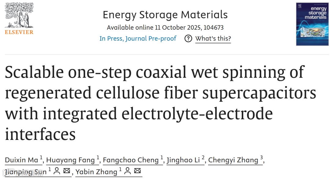 近日,广西大学孙建平教授&张亚斌教授合作在国际知名期刊《Energy Storage Materials》上发表题为“Scalable one-step coaxial wet spinning of regenerated cellulose fiber supercapacitors with integrated electrolyte-electrode interfaces”的研究论文。该工作提出了一种“一体化”构建策略,利用一步同轴湿法纺丝技术,同步构建电极与电解质层,成功实现了高性能纤维超级电容器的快速连续化与规模化制备。