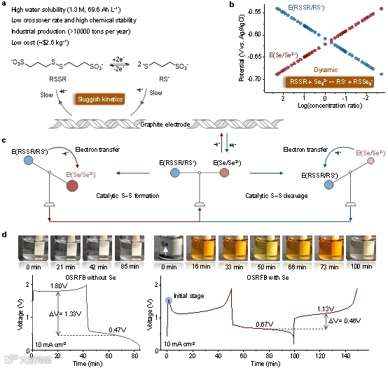 尽管RSSR材料优势显著,但其S-S键的断裂/形成需要较高的活化能(38.8 kcal mol⁻¹),导致本征电化学反应动力学缓慢。为解决此瓶颈,团队利用“动态均相催化”概念,其设计原理基于无机Se-Se键与RSSR中有机S-S键具有相近的电极电位(热力学基础),使得二者在溶液中能够发生动态、可逆的电子转移。具体而言,在充电过程中,硒物种在电极上获得电子后电位降低,从而驱动电子从硒物种流向RSSR,催化S-S键的断裂;放电过程则相反。硒物种在此过程中扮演了高效的“电子桥梁”角色,实现了对氧化和还原反应的双向加速,将电极过电位从0.89 V大幅降低至0.25 V。