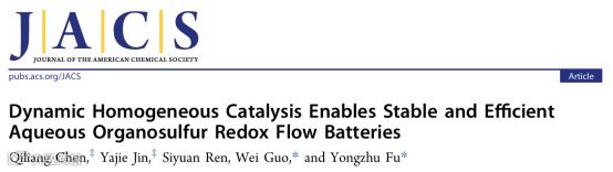 近日,郑州大学付永柱教授和郭玮教授团队在Journal of the American Chemical Society期刊发表题为“Dynamic Homogeneous Catalysis Enables Stable and Efficient Aqueous Organosulfur Redox Flow Batteries”的研究论文。本研究针对现有水系液流电池在成本、循环寿命和材料利用率等方面面临的挑战,提出并验证了一种采用低成本工业级有机二硫化物(RSSR,其中R代表丙基磺酸钠基团)作为负极活性材料、并通过引入元素硒(Se)诱导的动态均相催化(DHC)策略来构建高效电子转移桥以显著降低S-S键反应活化能,通过将RSSR的活化能垒从38.8降至低于25 kcal mol⁻¹,双向促进RSSR的反应动力学,从而成功构筑出兼具超长循环寿命(>2000次)、高能量效率(74.5%)及极低容量衰减率(0.0025%每循环)的高性能水系有机硫液流电池新体系。