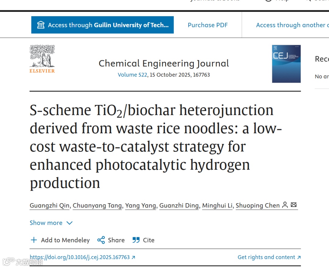 S-scheme TiO₂/biochar heterojunction derived from waste rice noodles: a low-cost waste-to-catalyst strategy for enhanced photocatalytic hydrogen production, Chemical Engineering Journal 522 (2025) 167763.