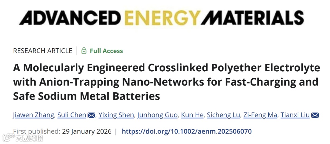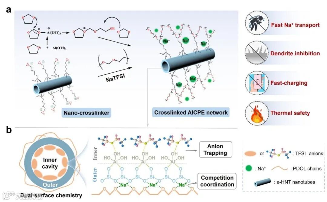 近日,江南大学刘天西教授与陈苏莉副教授团队在能源材料领域顶级期刊 Advanced Energy Materials 上发表了题为“A Molecularly Engineered Crosslinked Polyether Electrolyte with Anion-Trapping Nano-Networks for Fast-Charging and Safe Sodium Metal Batteries”的观点文章。该工作通过原位聚合策略,设计并制备了一种阴离子锚定交联聚醚电解质(AICPE),该电解质以环氧功能化埃洛石纳米管(e-HNTs) 为多功能填料,在聚合过程中构建三维共价交联网络,同时实现阴离子捕获与阳离子快速传输,大幅提升了电解质的机械强度、热稳定性与界面兼容性。