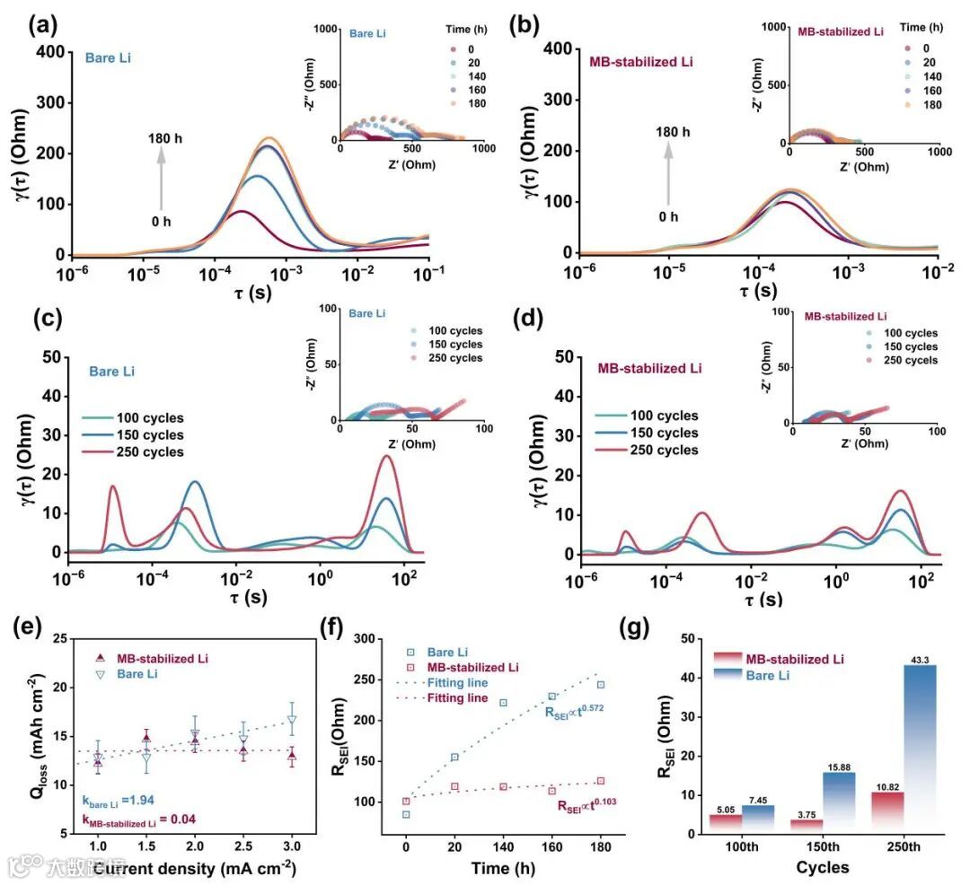 图5. MB衍生SEI的动力学分析。(a-b)裸锂以及MB稳定化锂随时间变化的DRT曲线 (从静置0 h至180 h),内置小图是对应的奈奎斯特图;(c-d)裸锂以及MB稳定化锂在循环100/150/250圈(1 mA cm-2, 1 mAh cm-2)后的DRT曲线,内置小图是对应的奈奎斯特图 。(e)裸锂以及MB稳定化锂在不同电流密度与对应损失容量的拟合曲线(Qir vs j),k值用于描述Li+在本征SEI以及MB衍生的SEI传输的均匀性。(f)不同静置时间与RSEI之间的关系拟合图;(g)裸锂与MB稳定化锂在不同循环圈数后的SEI阻值对比。