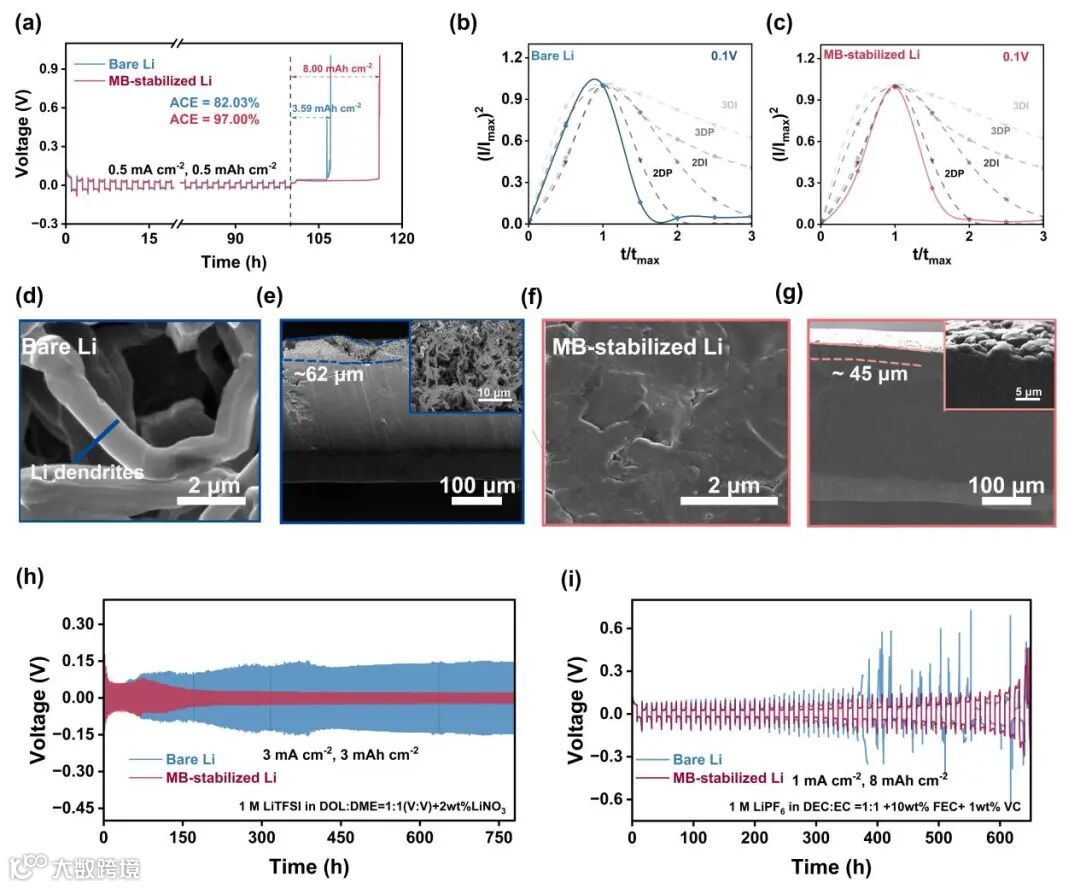图4. MB衍生的SEI对锂沉积的调控。(a)裸锂以及MB稳定化锂的Aurbach库伦效率描述。对称电池在0.5 mA cm-2, 0.5 mAh cm-2下循环50圈后充电至1 V。(b-c)裸锂以及MB稳定化锂对应的成核模型;(d-e)裸锂在沉积10 mAh cm-2锂后的表面以及截面SEM形貌图,已经出现明显的多孔结构以及锂枝晶;(f-g)MB稳定化锂在沉积10 mAh cm-2后的表面以及截面的SEM形貌图,沉积后的形貌仍然平整致密。(h)裸锂以及MB稳定化锂对称电池在3 mA cm-2, 3 mAh cm-2下的极化电压-时间图(醚类电解液);(i)裸锂以及MB稳定化锂对称电池在1 mA cm-2, 8 mAh cm-2下的极化电压-时间图(酯类电解液)。