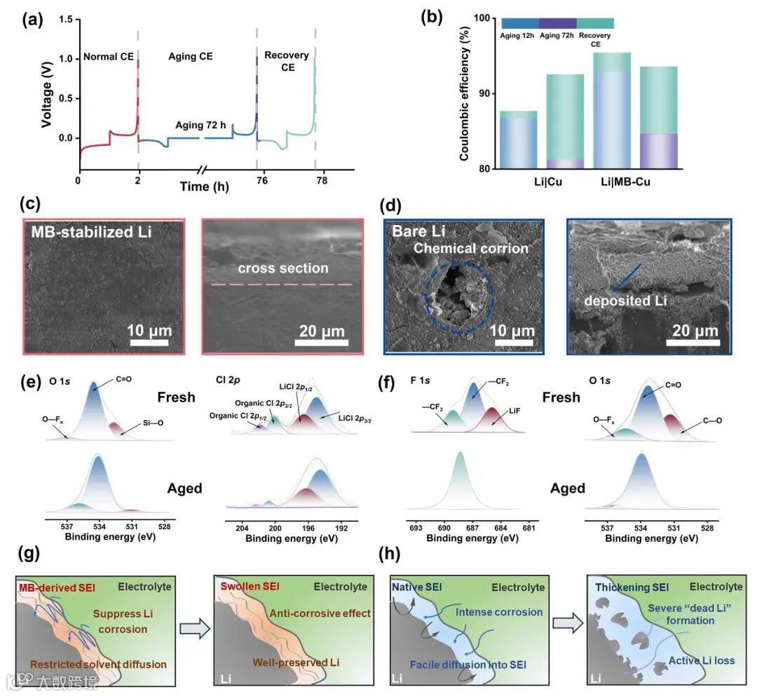 图3 MB-衍生SEI的界面稳定性。(a)Li||Cu电池在循环过程中静置72小时的电压曲线。正常循环:Li||Cu电池在1mA cm-2, 1mAh cm-2下循环1圈;老化循环:金属锂在1mA cm-2下沉积1小时后静置不同时间,然后在同样的电流密度下充电至1 V。(b)在Li||Cu与MB-Cu||Li电池间歇循环的库伦效率统计柱状图;(c-d)MB稳定化锂以及裸锂在电解液中老化14天后的SEM形貌。该部分的电池在0.5 mA cm-2, 0.5 mAh cm-2下循环5圈后在电解液中静置14天。(e)通过XPS分峰拟合的MB稳定化锂在新鲜以及老化状态下的O 1s和Cl 2p谱图;(f)通过XPS分峰拟合的裸锂在新鲜以及老化状态下的F 1s以及O 1s谱图。新鲜状态:电池在0.5 mA cm-2, 0.5 mAh cm-2下循环5圈;老化状态:电池循环后在电解液中老化14天。(g-h)MB衍生的SEI以及本征SEI在电解液中化学腐蚀过程示意图
