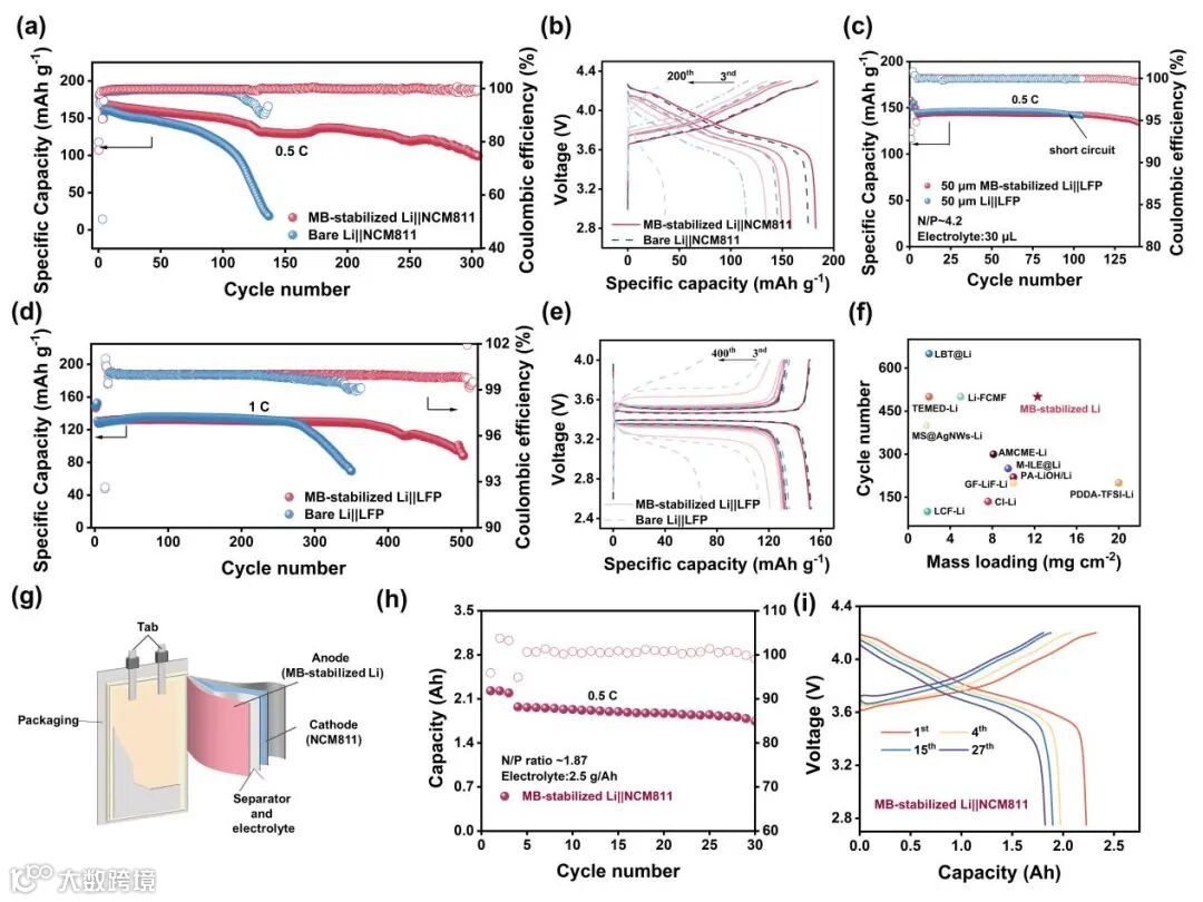 图6. 锂金属全电池性能评估。(a-b)Li||NCM811与MB-stabilized Li||NCM811在0.5C下的循环性能对比以及对应的电压曲线(450微米锂);(c)Li||LFP与MB-Li||LFP的循环性能对比(50微米锂);(d-e)Li||LFP与MB-stabilized Li||LFP在1C下的循环性能对比(450微米锂);(f)MB-stabilized Li||LFP与其他使用人工SEI修饰的Li||LFP电池性能对比;(g)Li||NCM811软包电池的示意图;(h-i)MB-stabilized Li||NCM811软包电池的循环稳定性以及对应的电压曲线。