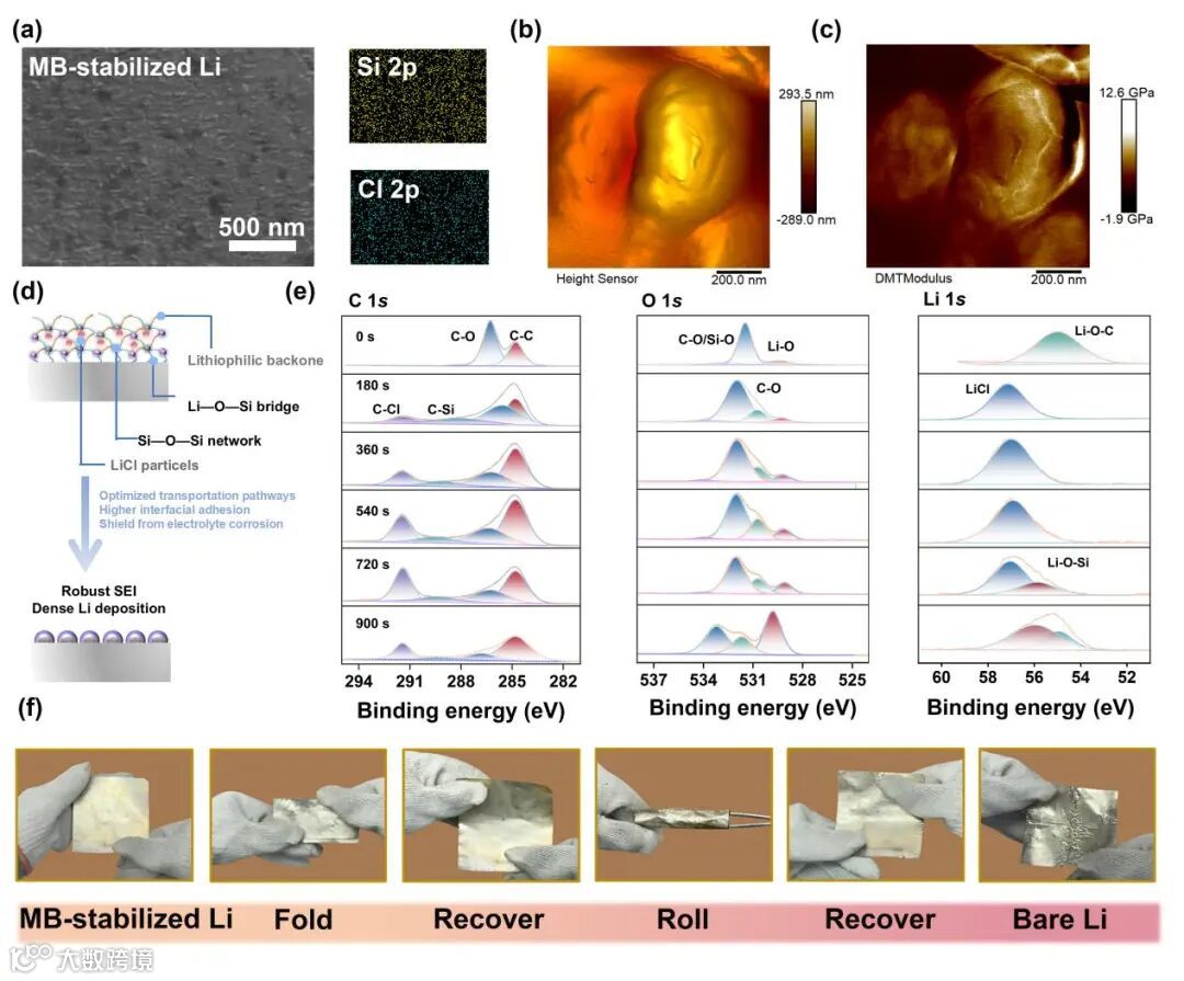 图2. MB稳定化锂的结构与组分分析。(a)MB稳定化锂的SEM图像与EDS谱图;(b-c)通过原子力显微镜下表征MB稳定化锂的DMT模量与粗糙度分布图;(d)MB稳定化锂的结构示意图;(e)通过XPS溅射分析MB稳定化锂在C 1s, O 1s和Li 1s上的谱图;(f)100微米的裸锂以及MB稳定化锂通过折叠/卷曲等方式后复原的光学照片