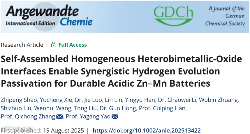 Zhipeng Shao, Yucheng Xie, Jie Luo, Lin Lin, Yingyu Han, Chaowei Li, Wubin Zhuang, Shizhuo Liu, Wenhui Wang, Tong Liu, Guo Hong, Cuiping Han, Qichong Zhang, Yagang Yao. Self-Assembled Homogeneous Heterobimetallic-Oxide Interfaces Enable Synergistic Hydrogen Evolution Passivation for Durable Acidic Zn–Mn Batteries. Angew. Chem. Int. Ed. 2025, e202513422.