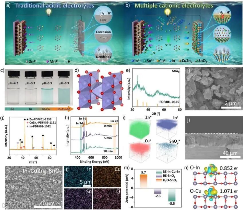 近日,南京大学姚亚刚教授团队与苏州纳米所张其冲研究员团队合作,提出了一种多阳离子协同调控策略,通过自组装构建均匀的异质双金属氧化物界面(In–CuZn5–SnO2),显著提升了锌负极在强酸性环境中的耐久性。该设计巧妙利用SnCl4水解产生的SnO2氧化物和In3+/Cu2+离子与锌金属的置换反应,自发形成具有优异耐酸性和丰富成核位点的异质界面。实验表明,该界面在pH=0.9的强酸性电解液中,可实现>85.5%的放电深度和超过1000hh的循环寿命。此外,SnCl4的水解还实现了自调节酸性环境,无需额外添加酸性介质。基于此设计的锌锰软包电池在1 mA cm-2电流密度下容量达1.39 mAh cm-2以及200次循环后容量保持率为84.9%。这种直接多阳离子协同调制自组装界面策略对于加速高安全性、大规模储能技术的发展具有重大潜力。其成果以题为“Self-Assembled Homogeneous Heterobimetallic-Oxide Interfaces Enable Synergistic Hydrogen Evolution Passivation for Durable Acidic Zn–Mn Batteries” 在国际知名期刊Angewandte Chemie International Edition上发表。