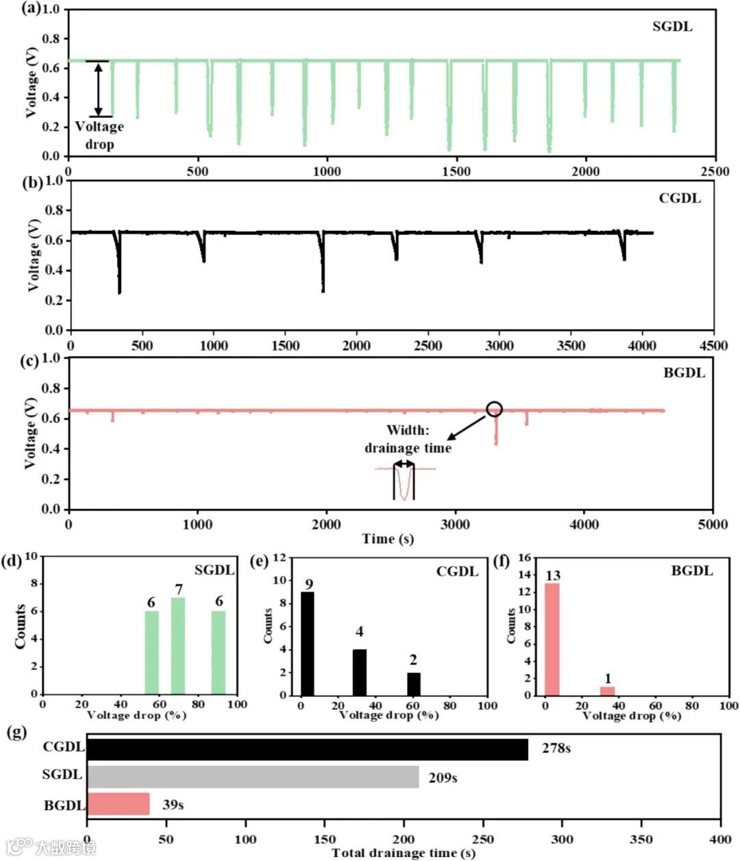 图4. 在 80℃、100% 相对湿度条件下,分别以 600 和 2000 sccm 的氢气与空气流量进行 GDL 水管理性能测试: (a–c) 展示了 SGDL、CGDL、BGDL 随时间变化的电压曲线; (d–f) 呈现了 SGDL、CGDL、BGDL 的浸水程度直方图;(g)展示了SGDL、CGDL和BGDL的总淹没时间直方图。