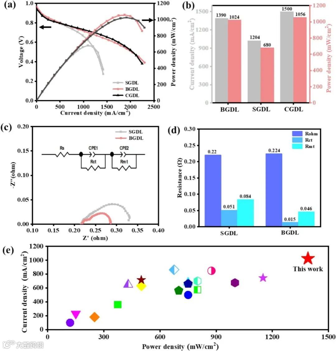 图3. PEMFC 性能测试:(a)BGDL、SGDL 和 CGDL 极化曲线测试条件:80℃、100% 相对湿度,氢气与空气流量分别为 600 和 2000 sccm;(b)PEMFC 性能直方图;(c) 样品 BGDL、SGDL 和 CGDL 在 0.65 V 电压下的奈奎斯特图曲线,测试条件为 80 ℃、100% 相对湿度,氢气与空气流量分别为 600 和 2000 sccm。奈奎斯特图展示了三种样品在相同条件下的特性。(d)电化学阻抗谱拟合计算结果直方图;(e)性能分布与先前研究的对比。