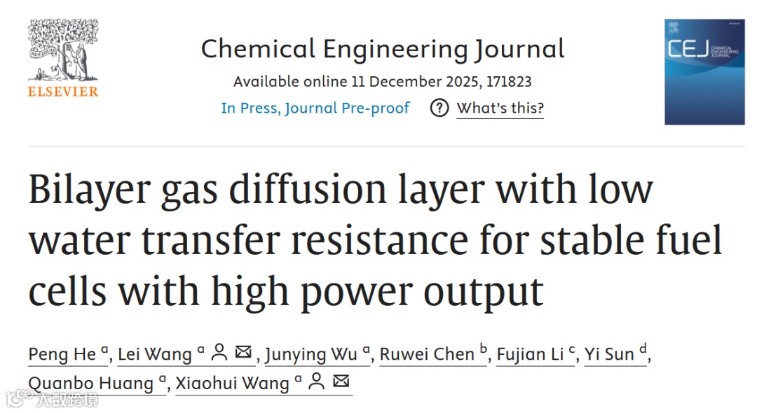 近日,来自华南理工大学的王蕾副教授与王小慧教授合作,在国际知名期刊Chemical Engineering Journal上发表题为“Bilayer gas diffusion layer with low water transfer resistance for stable fuel cells with high power output”的研究文章。该研究文章展示了一种新型的双层气体扩散层(BGDL),能够显著降低的透水压力并有效缓解了淹没现象。