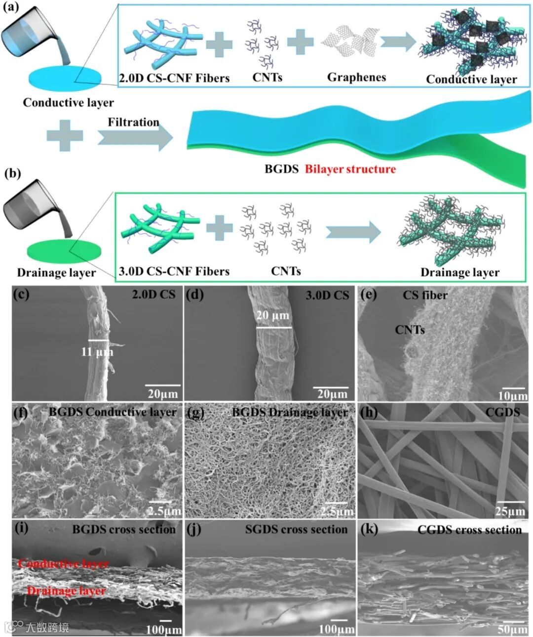 图1. BGDS的制备路线和微观形态表征:(a)导电层制备路线;(b)漏极层制备路线;BGDS的微观形态表征:(c)2.0D CS;(d)3.0D CS;(e)与碳纳米管复合的CS;(f)BGDS上导电层表面微观图像;(g)BGDS下漏极层表面微观图像;(h)CGDS表面SEM图像;(i)BGDS截面SEM图像;(j)SGDS截面SEM图像;(k)CGDS截面SEM图像。