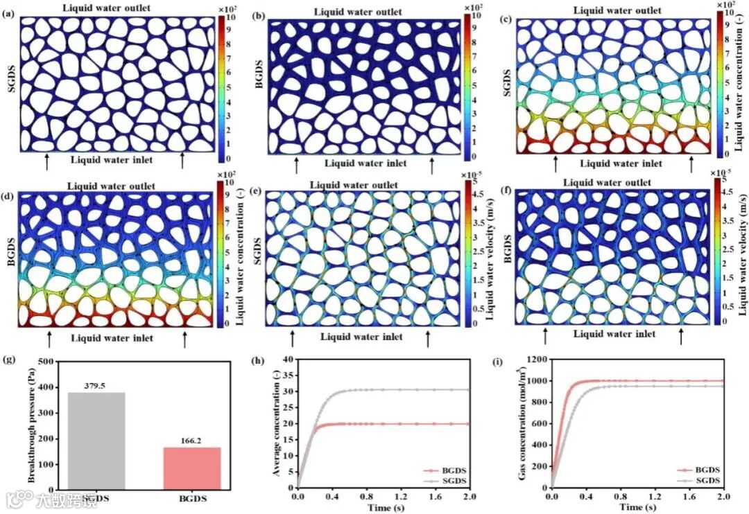 图5. COMSOL 仿真结果:(a, b)分别展示了 BGDS 和 SGDS 的微尺度模型。其中,BGDS的上部代表排水层,下部则构成导水层,水和气体的传输自底部向上进行;(c)和(d)分别显示了SGDS和BGDS在2秒后的水浓度场分布情况;(e)和(f)则分别显示了SGDS和BGDS的水流速场分布情况;(g)至(i)则分别绘制了突破压力、平均水浓度以及平均气浓度的分布图。