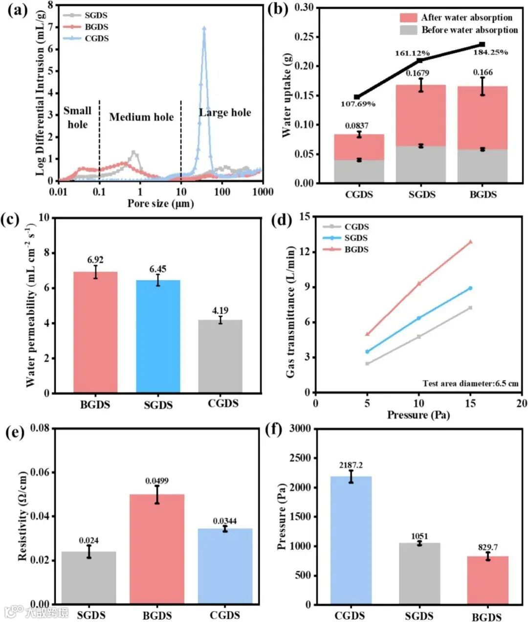图2. GDS 相关测试:(a)GDS 汞侵入孔隙度测试;(b)GDS 膨胀率与吸水率测试;(c、d)GDS 透水率与透气率测试;(e)GDS 电阻率测试;(f)GDS 抗水穿透性测试。