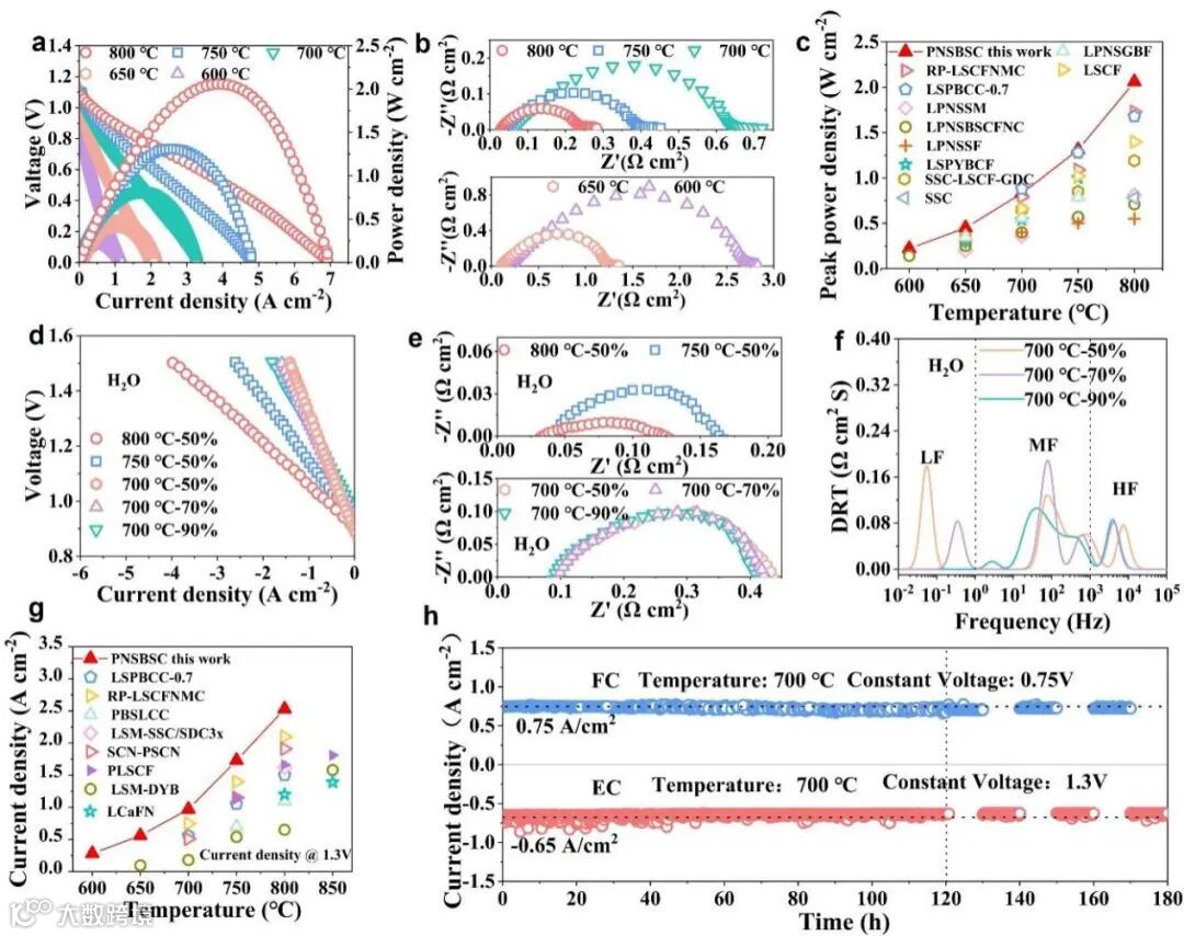 图7 采用高熵PNSBSC氧电极的纽扣电池性能:(a) 燃料电池模式下的典型I-V-P曲线及(b) 600–800°C对应的EIS;(c) 本工作电池与文献报道的采用高熵氧电极电池在燃料电池模式下的峰值功率密度对比;(d) 电解模式下的典型I-V曲线及(e) 在700–800°C下50% H₂O、以及700°C下50%–90% H₂O条件下的EIS;(f) 700°C下50%–90% H₂O对应EIS的DRT分析;(g) 本工作电池与文献报道的采用高熵氧电极电池在1.3 V电解电压下电流密度对比;(h) 在700°C下燃料电池、电解及可逆模式中的稳定性表现