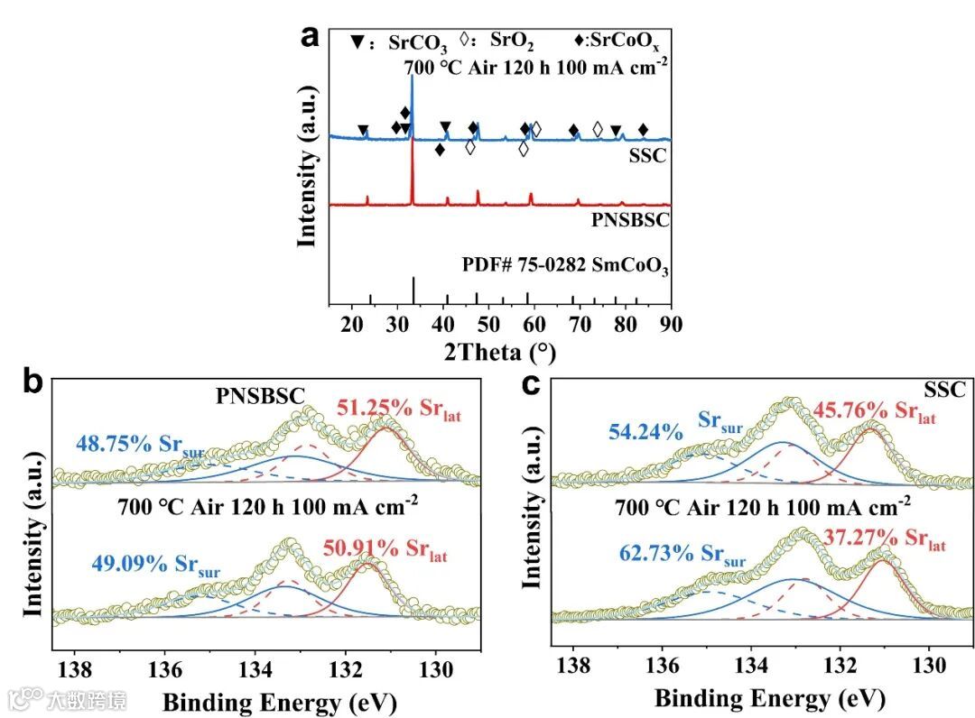 图5 稳定性测试后的PNSBSC和SSC氧电极的XRD和XPS