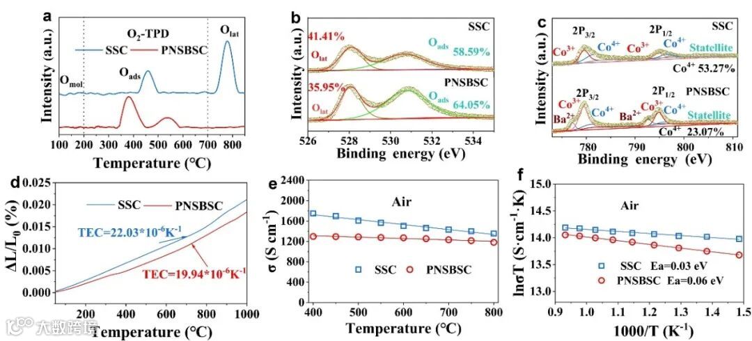 图2 SSC与PNSBSC的性能对比:(a) O₂-TPD曲线;(b) O 1s光谱;(c) Co 2p光谱;(d) 25–1000°C范围内测得的热膨胀系数曲线;(e) 空气中400–800°C测得的电导率;(f) 对应的阿伦尼乌斯图