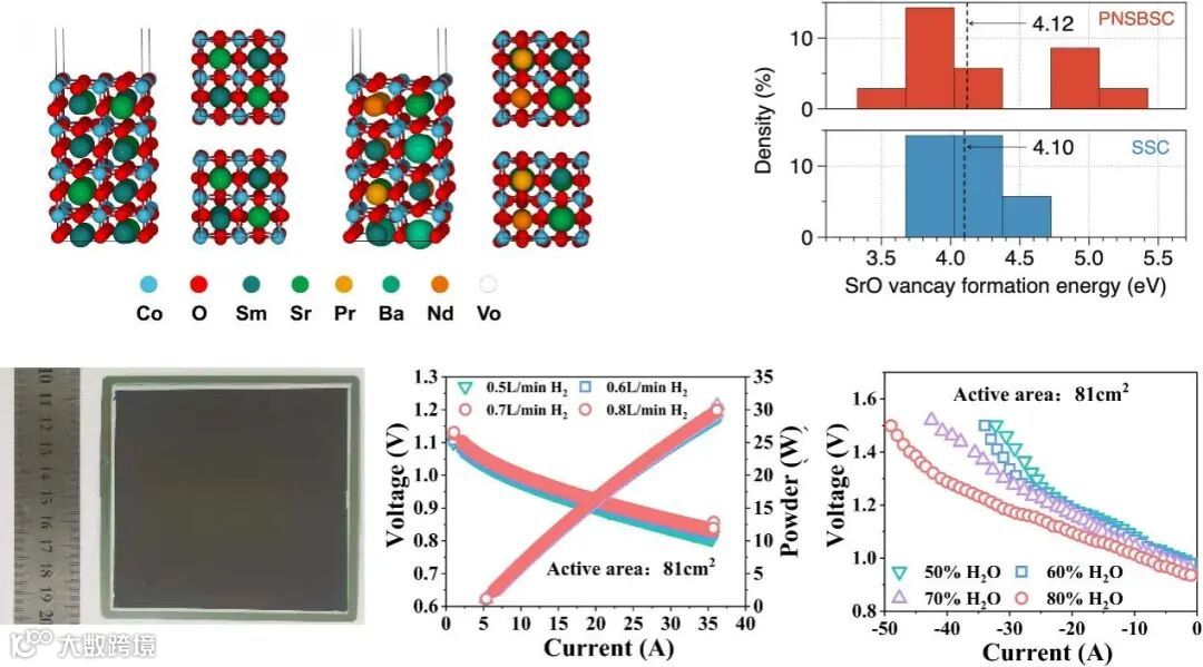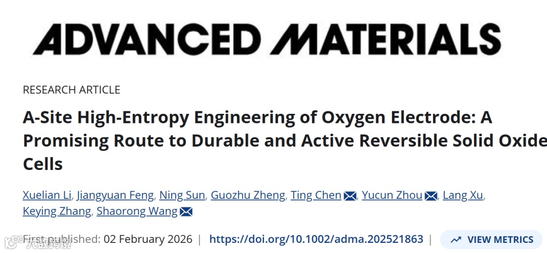 近日,中国矿业大学王绍荣教授、陈婷副教授与北京怀柔实验室周玉存研究员合作,在国际知名期刊Advanced Materials上发表题为“A-site High-Entropy Engineering of Oxygen Electrode: A Promising Route to Durable and Active Reversible Solid Oxide Cells”的研究论文。该文章设计开发了一种新型A位高熵钙钛矿氧化物Pr0.2Nd0.2Sm0.2Ba0.2Sr0.2CoO3-δ(PNSBSC)作为可逆固体氧化物电池(RSOCs)的氧电极。通过高熵工程策略,PNSBSC克服了传统钙钛矿活性与稳定性的权衡问题,表现出高氧空位浓度、低热膨胀系数及优异的ORR/OER催化活性。纽扣电池在800°C时燃料电池模式峰值功率密度达2.06 W cm-2,电解模式下1.3 V时电流密度为2.54 A cm-2,并展现出较好的稳定运行能力。大尺寸电池(81 cm2)验证了其可扩展性,DFT计算证实高熵设计提升了活性与稳定性。