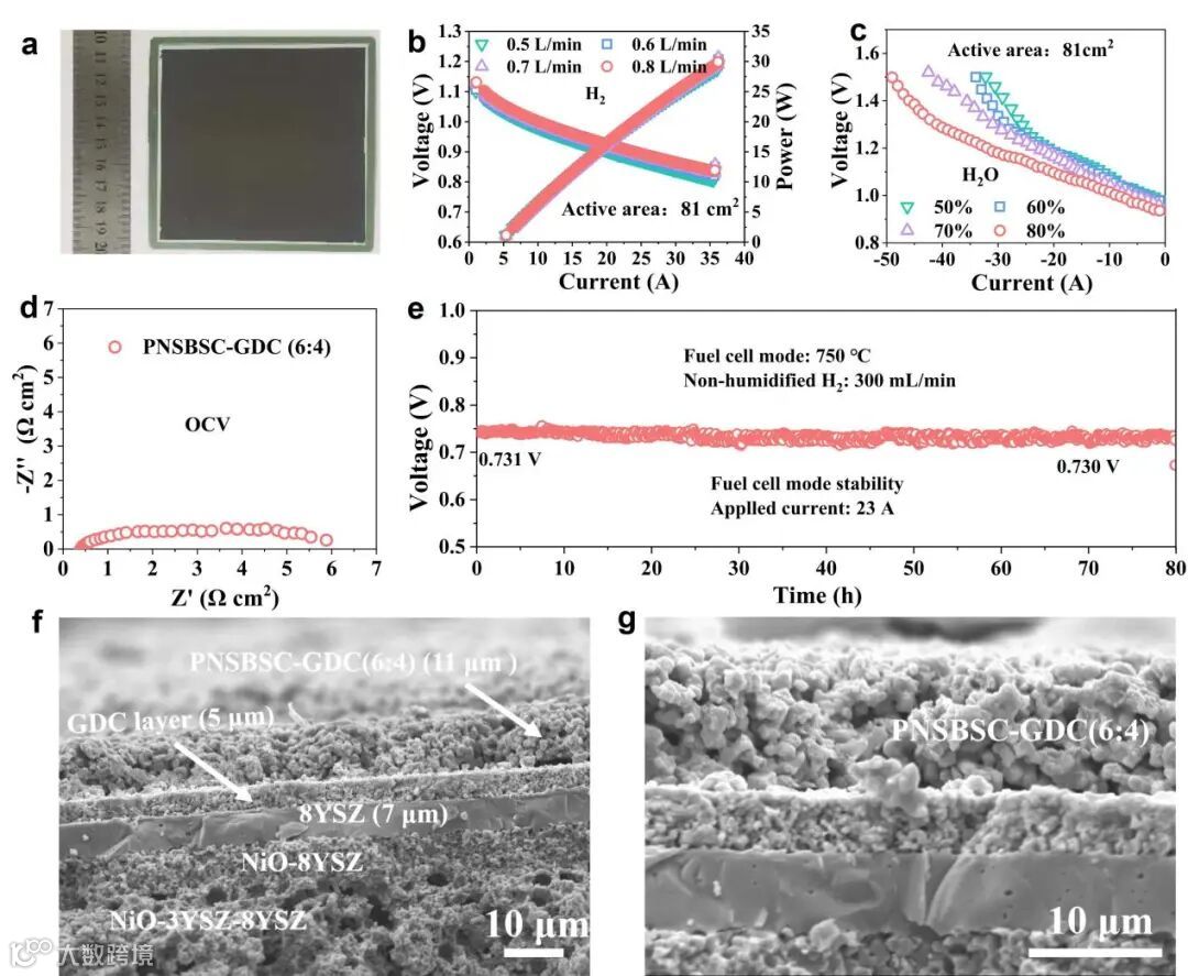 图8 (a) 10×10 cm²大面积电池照片;采用高熵PNSBSC氧电极的大面积电池在750°C下(b)燃料电池及(c)电解模式下的I-V-P曲线;(d) 燃料电池模式下的电化学阻抗谱;(e) 750°C下的稳定性测试;(f), (g) 稳定性测试后电池截面的SEM图像。