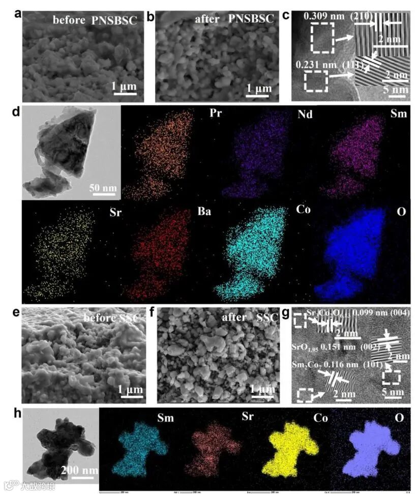 图4 PNSBSC氧电极稳定性测试 (a) 前与 (b) 后的SEM图像;(c) 稳定性测试后PNSBSC的HR-TEM图像及 (d) 对应的EDS元素分布图;SSC氧电极稳定性测试 (e) 前与 (f) 后的SEM图像;(g) 稳定性测试后SSC的HR-TEM图像及 (h) 对应的EDS元素分布图