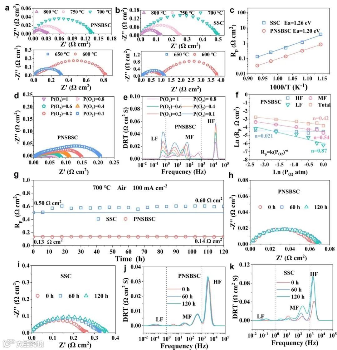 图3 (a) PNSBSC及 (b) SSC对称电池在600–800°C空气中测得的EIS;(c) PNSBSC与SSC电极对称电池的活化能对比;(d) PNSBSC在700°C下、不同氧分压条件下的EIS及 (e) 对应的弛豫时间分布(DRT)分析;(f) 不同频率区间内氧分压与Rp的关联性;(g) PNSBSC与SSC电极在700°C、100 mA cm⁻²条件下空气中的稳定性测试;PNSBSC (h) 与SSC (i) 对称电池在700°C空气中不同时间点测得的EIS;PNSBSC (j) 与SSC (k) 对称电池在700°C空气中不同时间点测得的DRT分析