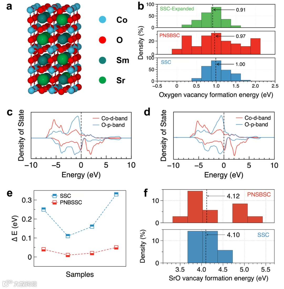 图6 (a) Sm₁₀Sr₆Co₁₆O₄₈晶体结构示意图; (b)分别基于超过50种不同构型的Sm₁₀Sr₆Co₁₆O₄₈(SSC)、Pr₄Nd₃Sm₃Ba₃Sr₃Co₁₆O₄₈(PNSBSC)及晶格参数扩大后的Sm₁₀Sr₆Co₁₆O₄₈计算的氧空位形成能频率分布直方图; (c) Sm₁₀Sr₆Co₁₆O₄₈与(d) Pr₄Nd₃Sm₃Ba₃Sr₃Co₁₆O₄₈的Co-3d带与O-2p带投影态密度PDOS图; (e) 分别基于超过4种不同构型的SSC与PNSBSC计算的Co-3d带与O-2p带中心的能量差; (f) 分别基于12种不同构型的SSC与PNSBSC计算的SrO-空位对形成能频率分布直方图