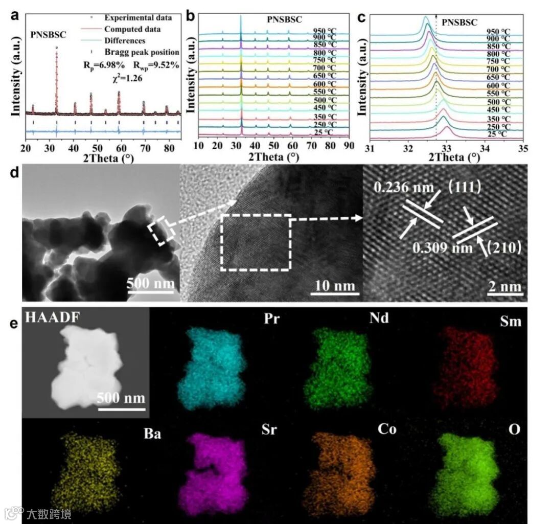 图1 PNSBSC的结构与成分分析。(a) Rietveld精修XRD图谱;(b) 原位高温XRD图谱;(c) 31–35°范围内主峰的放大视图;(d) 不同放大倍数下的HR-TEM图像;(e) HAADF图像及对应的EDS元素分布图