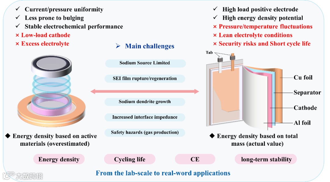 ALSMBs的高性能实现绝非单一组件的独立优化,而是电解质、SEI与集流体三者协同作用的结果。电解质化学决定初始SEI组成;集流体的形貌与化学性质影响成核动力学与沉积均匀性,进而作用于SEI的演化稳定性;而一个稳健的SEI又能反哺保护集流体与电解质。当前研究多在理想化条件下(如低载量、过量电解液)取得进展,但与实用化要求存在显著差距:软包电池在贫电解液、高正极载量下,面临钠源更快耗尽、电流分布不均、产气膨胀等严峻挑战。文章指出,未来突破方向在于:运用原位/工况表征技术(如冷冻电镜、同步辐射、质谱联用)深入揭示界面动态演化与失效机制;通过多物理场仿真与人工智能方法,指导多组分材料的理性设计与协同优化;发展可规模化、低成本的电极/电解质制备与集成工艺,并建立系统的安全评估体系,最终推动ALSMBs走向大规模储能与动力电池应用。
