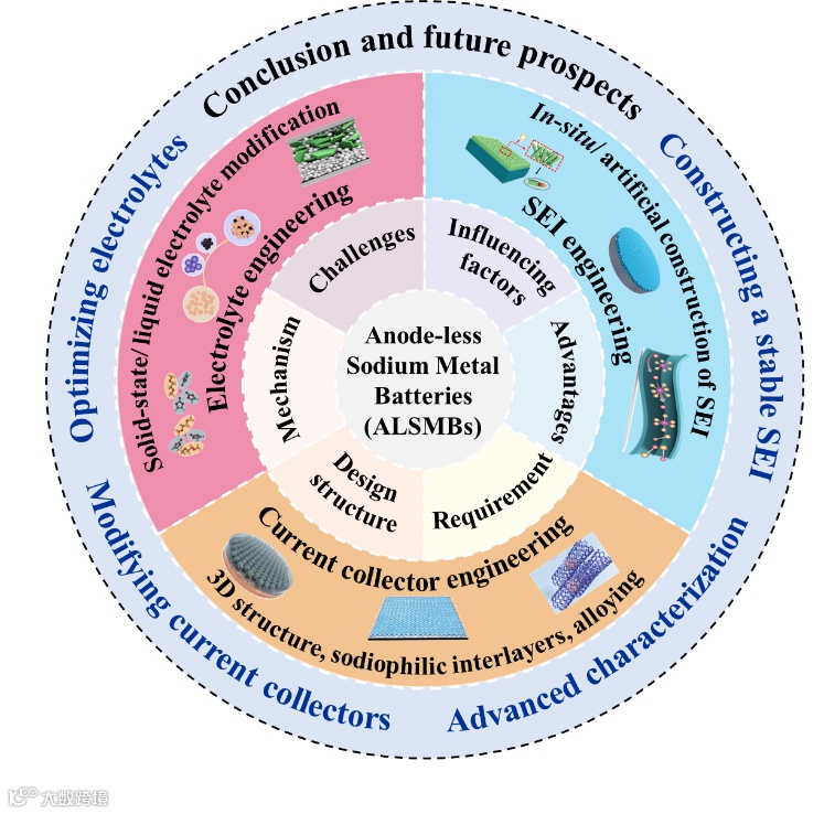 钠金属电池因钠资源丰富、成本低廉,被认为是大规模储能领域的重要候选技术。然而,传统钠离子电池能量密度普遍较低。采用金属钠负极虽可大幅提升能量密度,却面临加工困难、界面不稳定及安全风险等瓶颈。无负极钠金属电池(ALSMBs)通过取消预存的金属钠负极,在首次充电时于集流体上原位沉积形成超薄钠金属层,可实现超过400 Wh/kg的高能量密度,同时简化电池结构、降低成本并提升安全性。然而,该体系仍面临钠沉积不均匀、固体电解质界面相(SEI)不稳定、枝晶生长以及循环寿命有限等关键挑战。因此,系统梳理ALSMBs的失效机制与优化策略,对于推动下一代高能量密度钠电池发展具有重要意义。