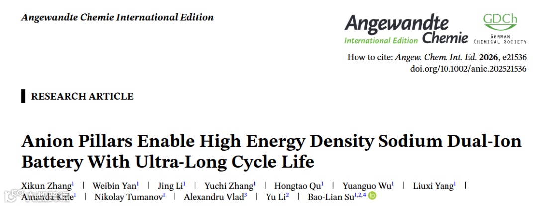 近日,比利时那慕尔大学/武汉理工大学苏宝连院士团队,在国际知名期刊 Angewandte Chemie International Edition 上发表题为 “Anion Pillars Enable High Energy Density Sodium Dual-Ion Battery With Ultra-Long Cycle Life” 的研究论文。该工作聚焦钠基双离子电池中石墨正极在阴离子反复嵌脱过程中面临的结构不稳定问题。作者提出了一种创新的“阴离子支柱(anion pillars)”策略,通过将 PF6-阴离子预先引入石墨层间,实现对层间距的有效调控与长期稳定,从而显著抑制结构塌缩并促进阴离子可逆嵌脱。文章系统分析了阴离子支柱对石墨结构演化、阴离子存储行为及界面稳定性的影响,并结合电化学测试与多种表征手段,展示了该策略在提升能量密度和超长循环寿命方面的显著优势。该研究为解决钠基双离子电池正极结构失稳这一关键瓶颈提供了新的思路,也为层状电极材料的结构稳定化设计提供了重要参考。