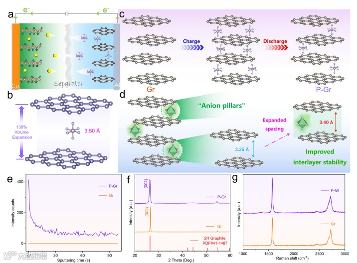 通过 XRD、Raman、TOF-SIMS及固态NMR等多种表征手段,作者系统揭示了 PF6- 阴离子在石墨层间的空间分布、循环过程中的可逆行为及其长期稳定性。结果表明,阴离子支柱在缓冲层间应力、限制层间过度膨胀方面起到了关键作用,使石墨在高电压阴离子嵌脱条件下仍能保持高度结构完整性,从而实现超长循环寿命和极低容量衰减率。