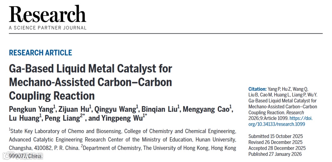 近日,湖南大学吴英鹏教授与香港大学梁芃研究助理教授团队合作,在《Research》期刊上发表题为“Ga-Based Liquid Metal Catalyst for Mechano-Assisted Carbon-Carbon Coupling Reaction”的研究论文。该工作提出了一种机械辅助液态金属催化策略,构建了金属基“介质-催化”一体化反应体系,利用液态金属兼具动态催化与溶剂功能的特性,一步实现了多元液态金属催化体系的构建和有机小分子的高效碳-碳偶联,为绿色、高效有机合成提供了新思路。