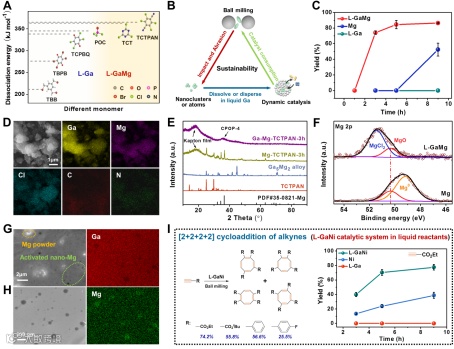 该策略成功应用于乌尔曼型还原偶联与[2+2+2+2]炔烃环加成反应,液态金属体系(L-Ga、L-GaMg、L-GaNi)在反应速率、选择性与稳定性方面均优于传统固态金属催化剂。并克服了传统有机溶剂中难溶物合成困难的问题。