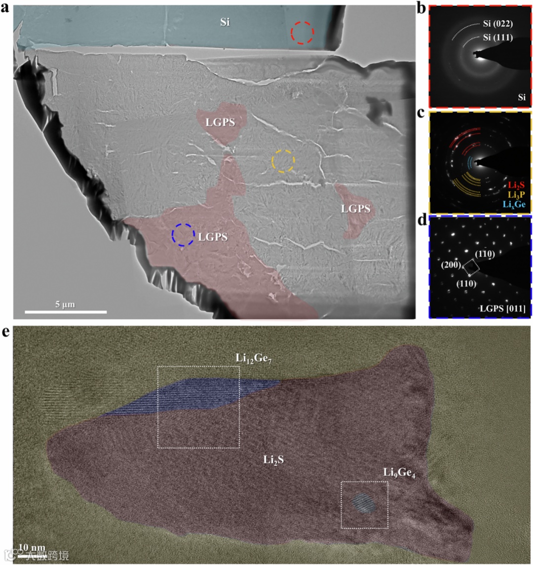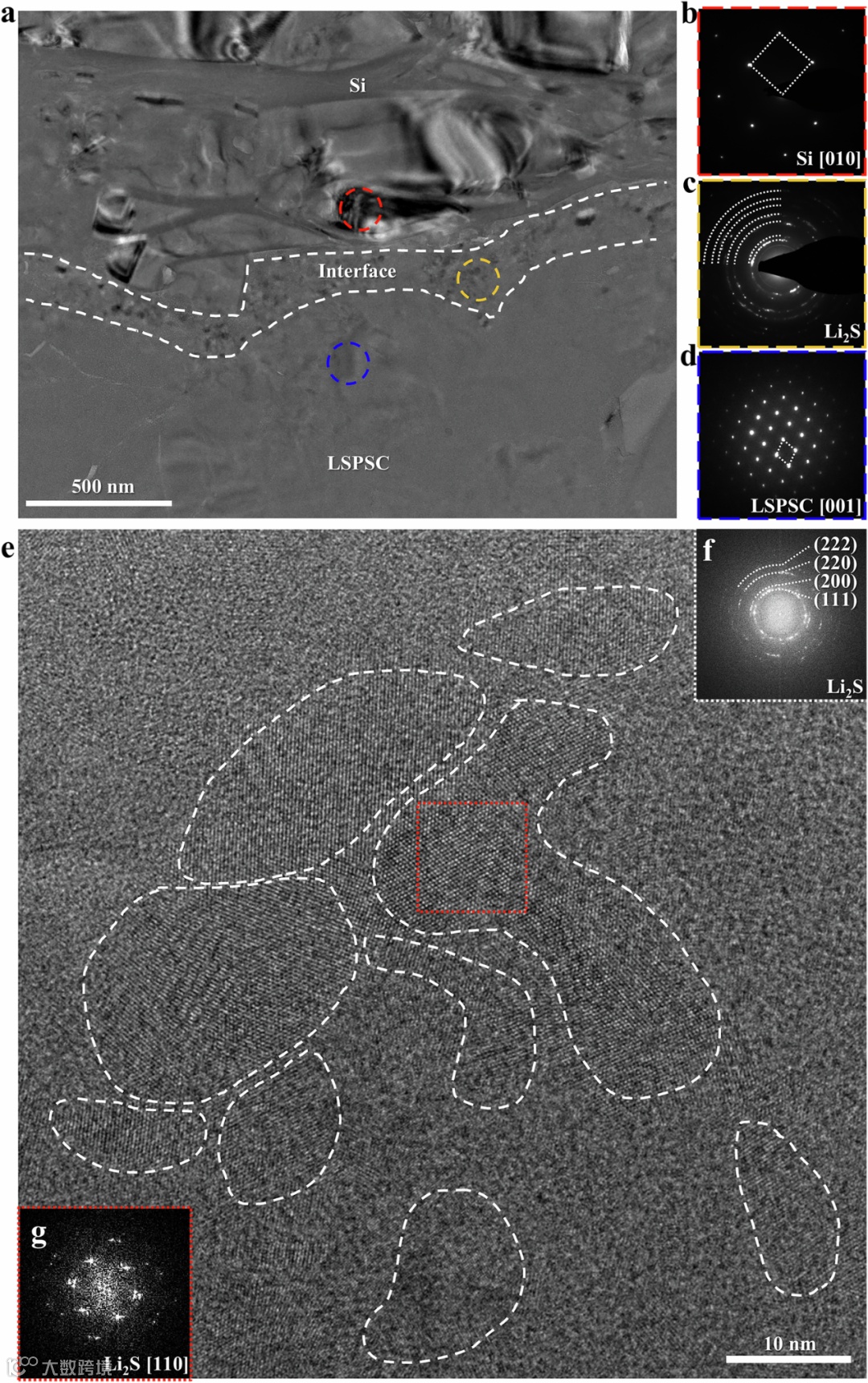 图3. 在25°C、90 mA/g电流密度下循环100次后处于脱锂状态的Si/LGPS界面的cryo-TEM图像和纳米结构。