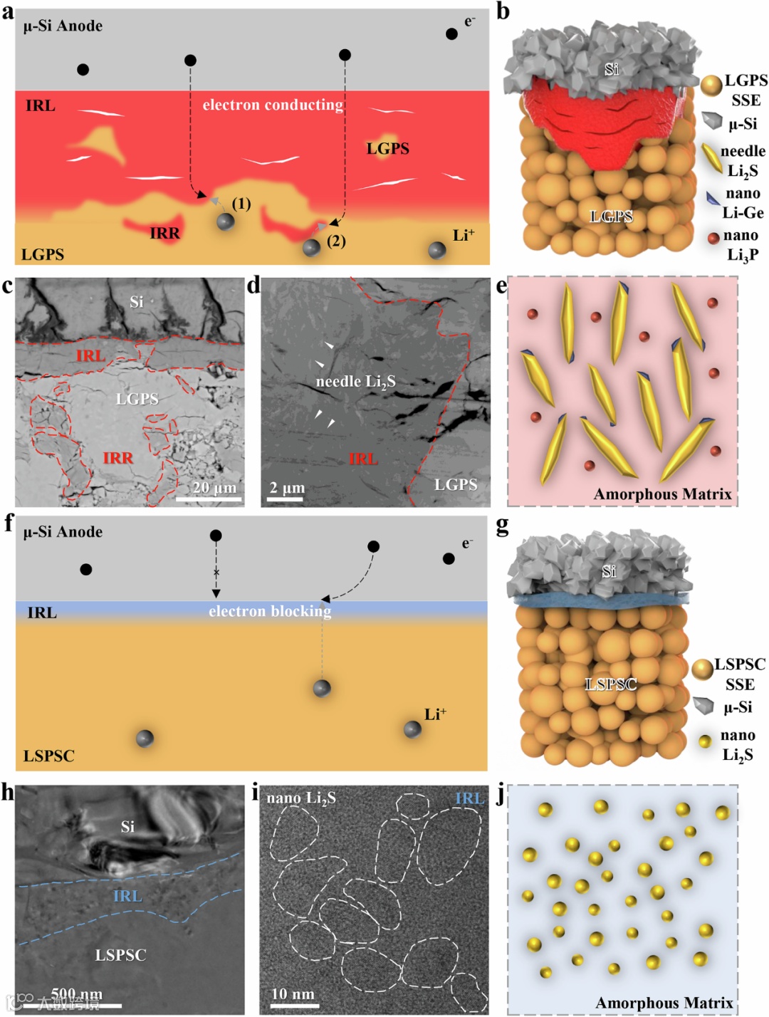 在 ASSB 中LGPS的全电池CBS图像结果显示,在100次循环后,靠近μ-Si负极表面的LGPS电解质中存在约10μm厚的界面反应层(IRL),它从μ-Si负极附近的LGPS表面开始,以10μm的几乎均匀厚度传播到LGPS内部。此外,还观察到与界面反应层具有相似对比度并分散在未反应的LGPS中的孤立反应区(IRR)。IRR从IRL底部传播到整个LGPS电解质。而在采用LSPSC电解质的全电池中,经过100次循环后,Si和SSE之间没有观察到明显的IRL,并且μ-Si负极和LSPSC都在界面处突然终止,表明Si/LSPSC界面是稳定的。