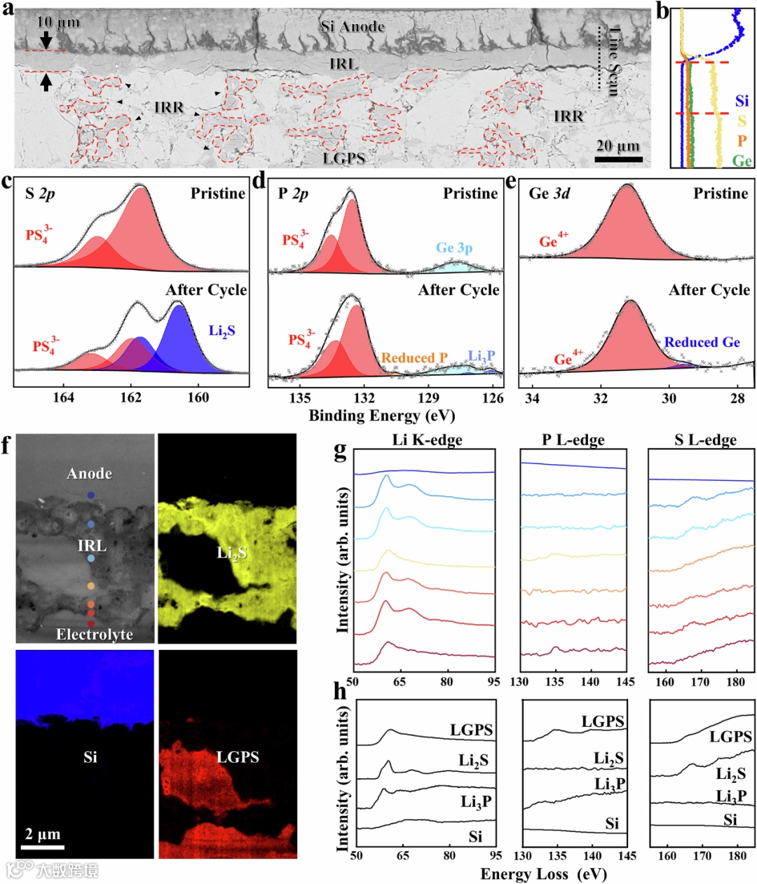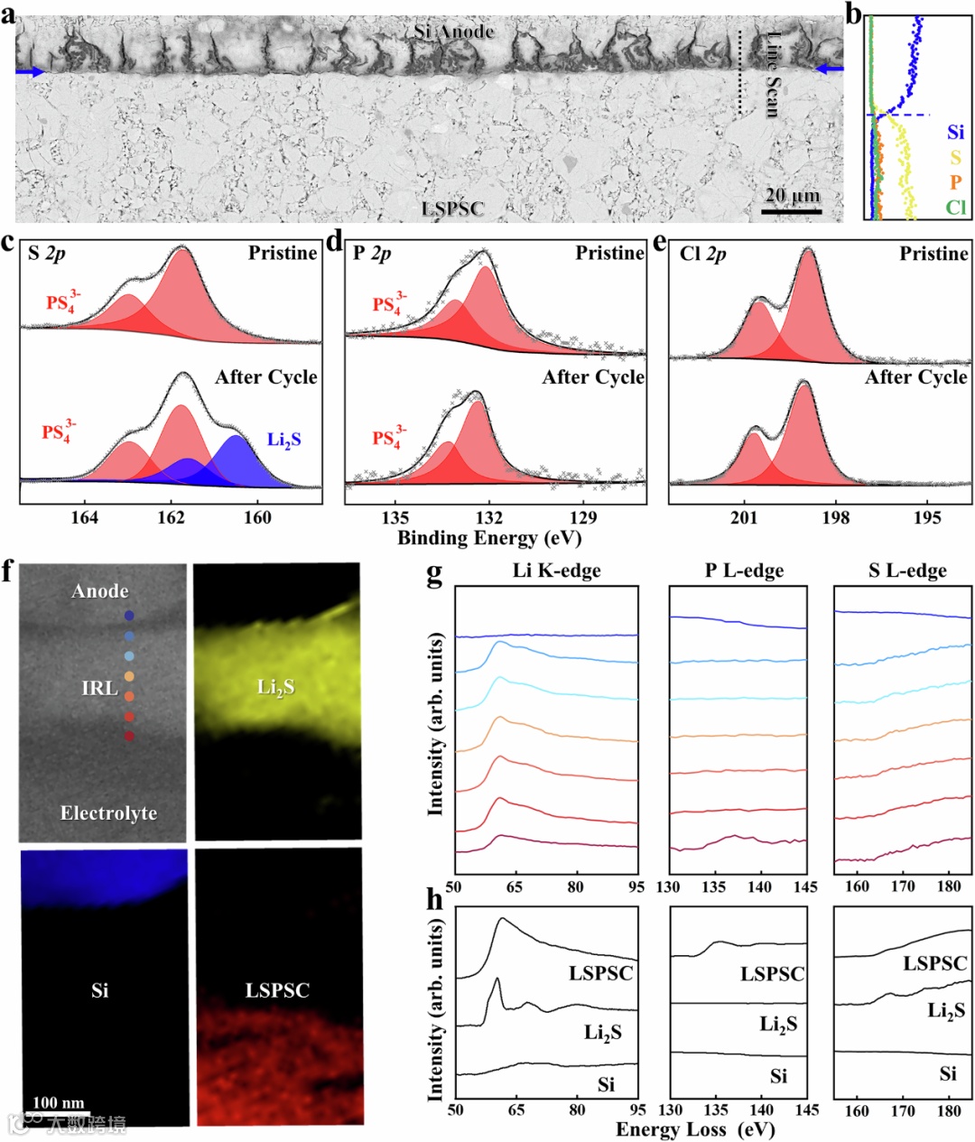 图2. 基于LGPS固态电解质的Si|SSE|NMC811电池在25°C、90 mA/g电流密度下循环100次后处于脱锂状态下的界面表征。