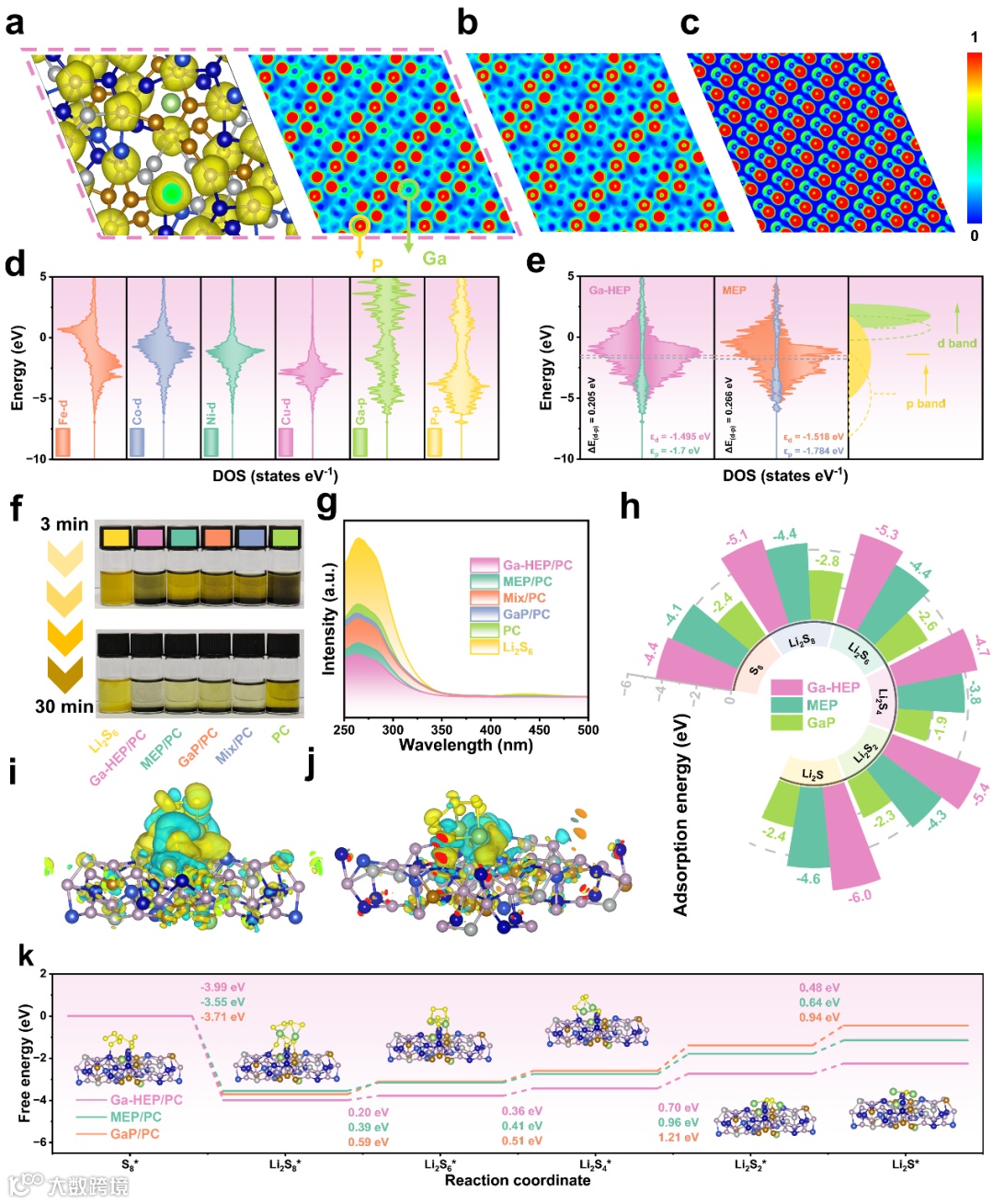 Figure 2. Theoretical studies of Ga-HEP, MEP, and GaP models for the sulfur reduction reaction. a) ELF model of Ga-HEP (left) and its cross-sectional view (right). b) ELF of MEPc) ELF of GaP. d) Density of states (DOS) of Ga-HEP. e) Schematic illustration of d-p orbital gaps and their comparison between Ga-HEP and MEP. f-g) Visual adsorption and corresponding UV absorption spectra of Ga-HEP/PC, MEP/PC, Mix/PC, GaP/PC, and PC. h) Calculated adsorption energies of LiPSs on Ga-HEP, MEP, and GaP. i–j) Charge density variation upon Li2S6 adsorption on Ga-HEP and MEP. k) Gibbs free energy diagram of the sulfur reduction reaction on Ga-HEP, MEP, and GaP.