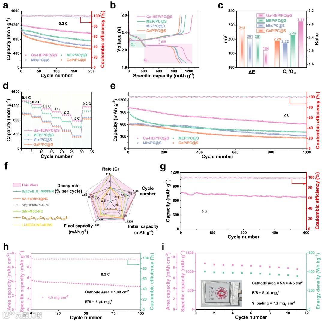 Figure 6. a) Cycling performance and b) galvanostatic charge/discharge profiles of various cathodes at 0.2 C. c) ΔE and QL/QH values derived from b). d) Rate performance from 0.2 C to 5 C. e) Long-term cycling performance at 2 C. f) Performance radar chart of Ga-HEP/PC@S cathode compared with recently reported works. g) Long-term cycling performance at 5 C. h) Cycling performance of cathodes with high sulfur loading (4.5 mg cm–2) at 0.2 C. i) Cycling performance of a Li–S pouch cell with Ga-HEP/PC@S cathode and its digital photograph at 0.05 C.