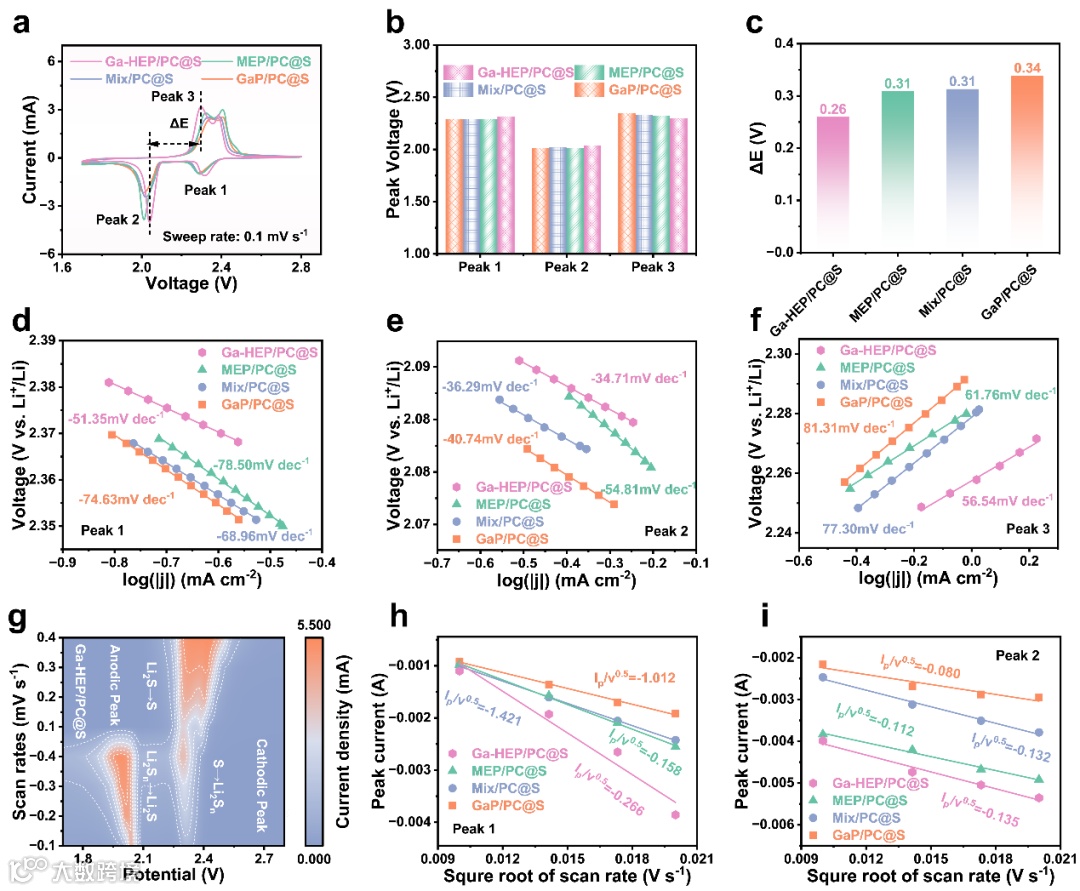 Figure 4. a) CV curves of Ga-HEP/PC@S, MEP/PC@S, Mix/PC@S, and GaP/PC@S at a sweep rate of 0.1 mV s–1. b) Corresponding reaction peak voltages. c) Calculated polarization voltages. d–f) Tafel plots for peaks 1, 2, and 3, respectively. g) CV curves of Ga-HEP/PC@S at sweep rates from 0.1 to 0.4 mV s–1. h, i) Plots of CV current values for peaks 1 and 2 versus the square root of the scan rates.