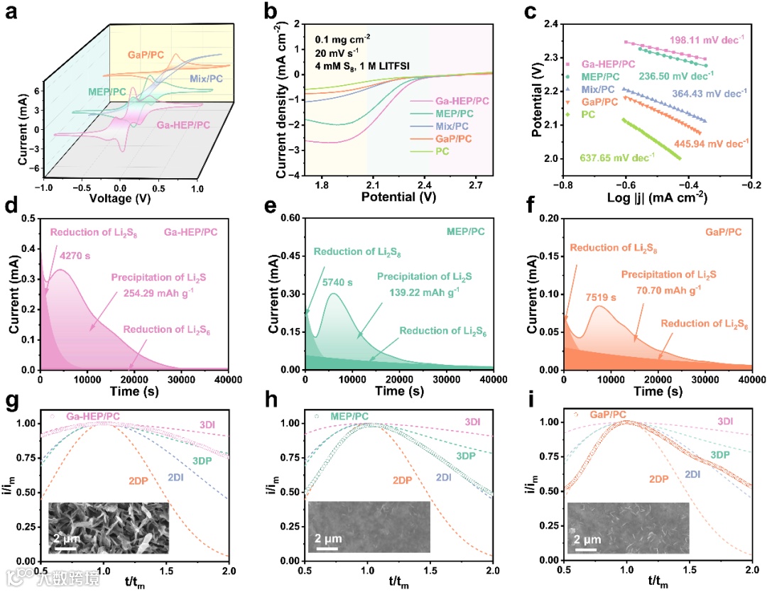 Figure 3. a) CV profiles of symmetrical cells with Ga-HEP/PC, MEP/PC, Mix/PC, and GaP/PC at a sweep rate of 1.0 mV s–1. b) LSV curves and c) corresponding Tafel plots for Ga-HEP/PC, MEP/PC, Mix/PC, and GaP/PC. Potentiostatic discharge profiles of Li2S nucleation at 2.12 V on different electrodes: d) Ga-HEP/PC, e) MEP/PC, and f) GaP/PC. Dimensionless transient curves (symbols) for g) Ga-HEP/PC, h) MEP/PC, and i) GaP/PC compared with theoretical 2D and 3D models, with corresponding SEM images shown in the insets.