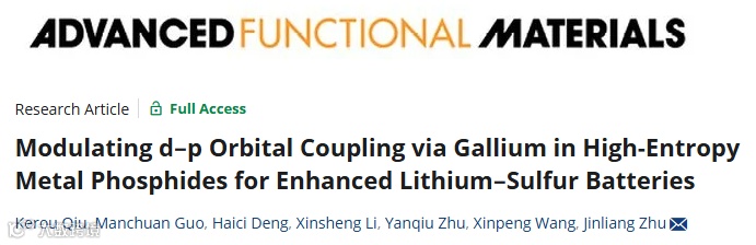 近日,来自广西大学的朱金良教授在国际知名期刊Advanced Functional Materials上发表题为“Modulating d–p Orbital Coupling via Gallium in High-Entropy Metal Phosphides for Enhanced Lithium–Sulfur Batteries”的研究文章。该研究文章成功合成了优化的高熵磷化物 Fe0.5Co0.7Ni0.5Cu0.3Ga0.1P(Ga-HEP),通过P区金属镓调控高熵金属磷化物的d-p耦合。这项工作不仅为设计高熵金属磷化物提供了新策略,也为开发锂硫电池中高效的LiPS转化催化剂开辟了新途径。