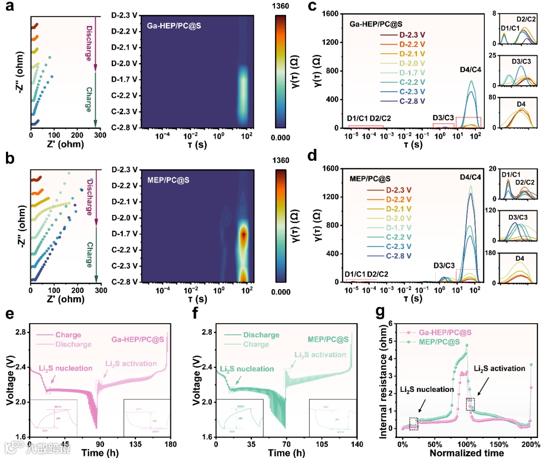 Figure 5. In situ EIS evolution of a) Ga-HEP/PC@S and b) MEP/PC@S cathodes at different voltages, along with the corresponding 2D intensity color maps of DRT calculated from EIS. DRT curves for c) Ga-HEP/PC@S and d) MEP/PC@S, corresponding to the intensity color maps at various discharge/charge states. GITT voltage profiles of e) Ga-HEP/PC@S and f) MEP/PC@S. g) Internal resistances of Ga-HEP/PC@S and MEP/PC@S.